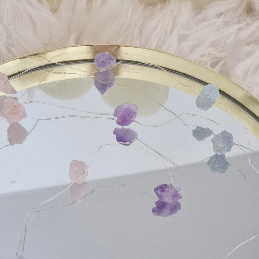 Lyskæde med Rosenkvarts, Citrin, Fluorit, Celestit, Ametyst, Bjergkrystal & Røgkvarts | Healing